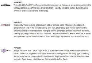 The repositioned DURACAP™ reinforced underlays and fully redesigned uppers, combined with a new two-part foxing tape that features a deeper knurl pattern on the toe, make the new Athletic Skate Sk8-Hi durable enough to withstand daily skateboarding abuse. For more board control, the new molded heel counter and internal tongue straps lock in your feet. Even the gum rubber sole that made Vans famous has been elevated with the SICKSTICK™ rubber compound to deliver more grip and boardfeel. Plus, POPCUSH™ energy return sockliners provide superior cushioning and impact protection while helping to lessen leg fatigue for longer skate sessions. Internal heel stiffeners have also been added to provide more support and stability.