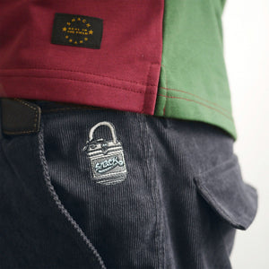 Corduroy cargo pants with embroidered pocket logo, side rear, and cargo pockets, and adjustable ankle opening. Embroidered lock logo by GKode